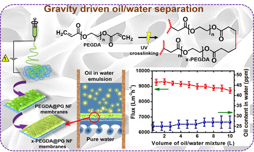 我們采用先進(jìn)的工業(yè)膜技術(shù),利用所制備的x PEGDA @ PG NF膜所顯現(xiàn)的超親水性膜超低濕潤(rùn)時(shí)間,結(jié)合相對(duì)的疏水特性,以實(shí)現(xiàn)達(dá)到有效的分離為兩個(gè)不相混溶的油-水混合物和油包水微乳液,且僅由重力驅(qū)動(dòng)。
